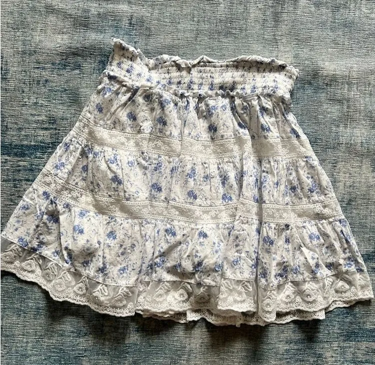 Altar'd State White Blue Ruffle Lace Floral Skirt Size XS White and blue floral skirt with lace inl... Show more