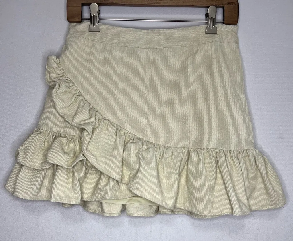 Waist 28 inches Length 14.5 inches Condition: excellent Chic mini skirt with cascading ruffles.... Show more
