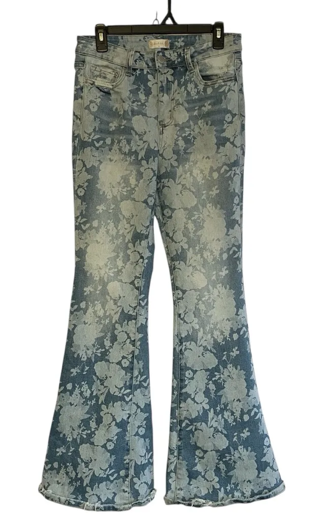 Chic wide leg jeans with floral design. Perfect for casual wear. Adds flair to any outfit.