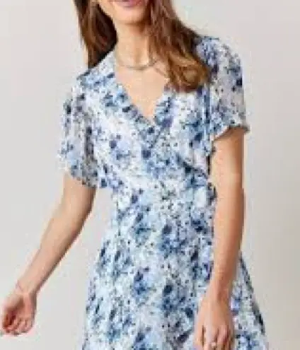 This casual sundress features a charming wrap design with a v-neckline and flutter sleeves, perfect... Show more