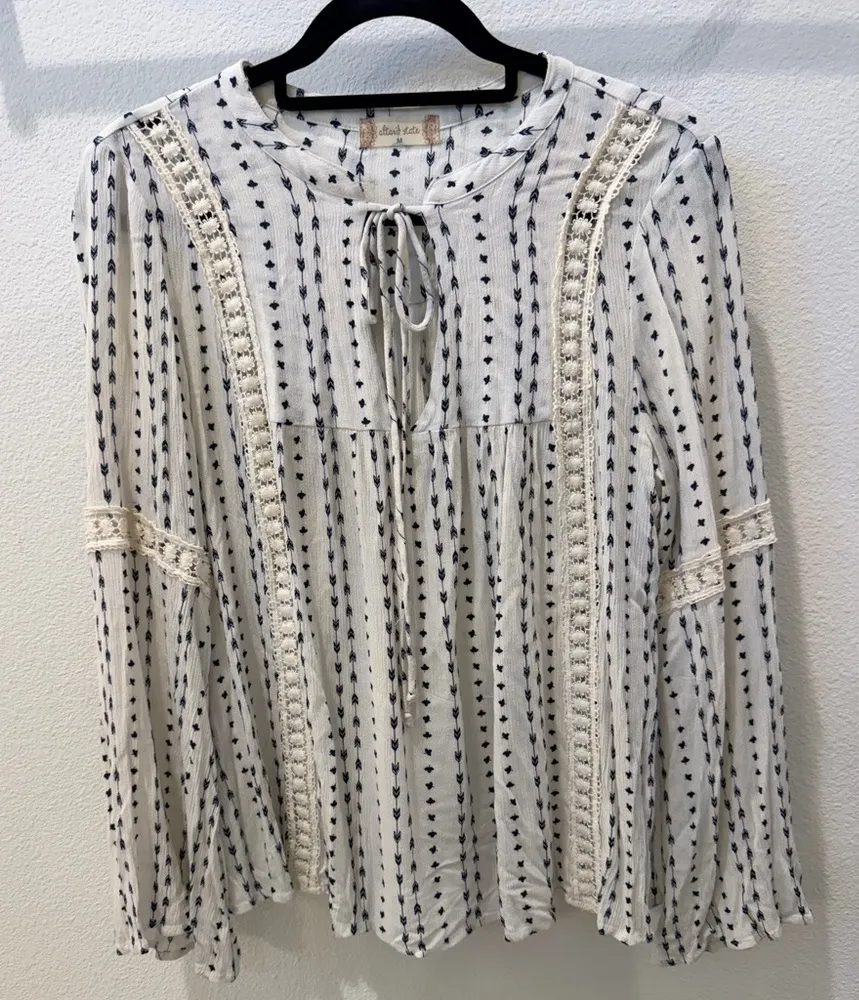 Chic Altar’d State blouse with black patterns on white. Features lace embroidered details and tie fr... Show more