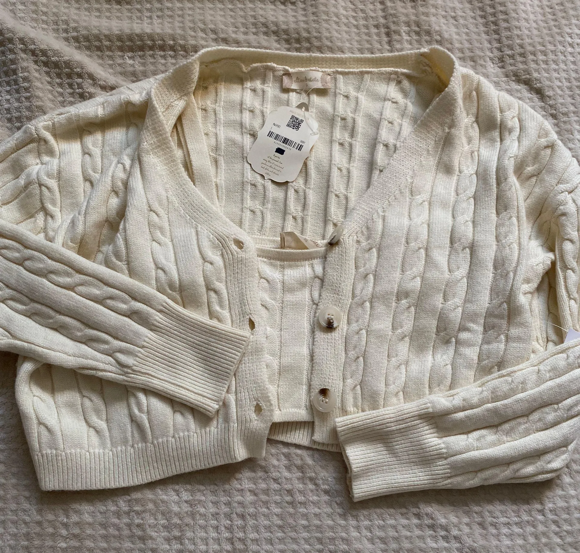 super cute cream altar’s state cardigan with matching tank top! - size small cardigan and the tank... Show more