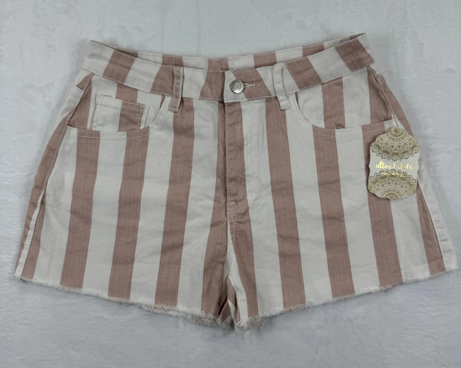 Style: Cut-Off Department: Women Fabric Type: Denim Material: Cotton Blend, Spandex Theme: Summer Style, Festival Occasion: Casual, Party/Cocktail Accents: Fringe Pattern: Striped Features: Pockets, Stretch Front Type: Flat Front Keywords: Altar State shorts, womens shorts, size M shorts, pink white striped shorts, denim shorts, cutoff shorts, frayed hem shorts, high waisted shorts, summer shorts, casual shorts, fashion shorts, cute shorts, trendy shorts, boho shorts, festival shorts Thank you for viewing my listing! Please see the photos for a detailed look at its CONDITION and MEASUREMENTS. All preowned items have been steam cleaned and/or washed. Feel free to reach out with any questions.