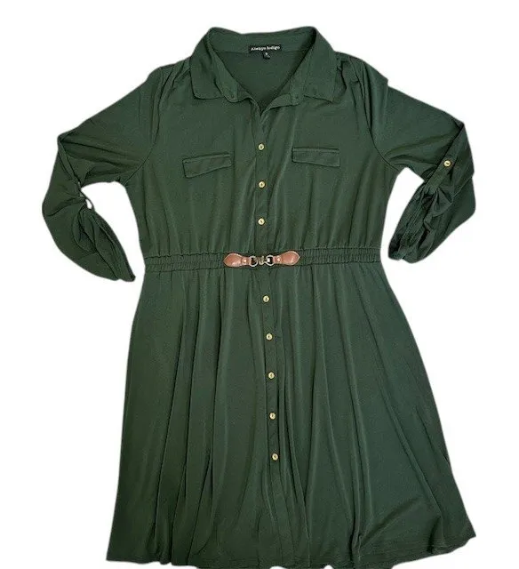 **Small spot on left side skirt area of dress. See picture #9** Elevate your everyday style with this chic olive green shirt dress. The dress features a classic button-front design, complete with a stylish belt at the waist to accentuate your figure. Long sleeves offer versatility, while the two chest pockets add a touch of utility and visual interest. Approximate Flat Lay Measurements: Pit to pit = 20" Waist = 17" Length (Shoulder to hem) = 36" Style: Shirt Dress Dress Length: Midi Color: Olive Green Sleeve Length: Long Sleeve Occasion: Casual, Workwear Material: Spandex, Jersey Knit Neckline: Collared Character: Boho, Casual, Chic, Office, Relaxed Season: Fall, Spring, Summer Keywords: shirt dress, olive green dress, button front dress, belted dress, long sleeve dress, casual dress, midi dress, women's dress, Always Indigo, 1X dress, boho dress, bohemian dress, work dress