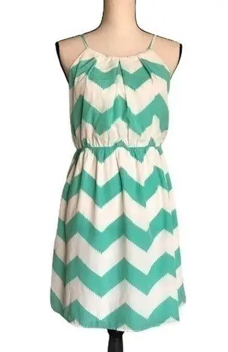 Alya Chevron Print Green White Chiffon Dress Sz M Halter Styling Keyhole back with tie Elasticiz... Show more