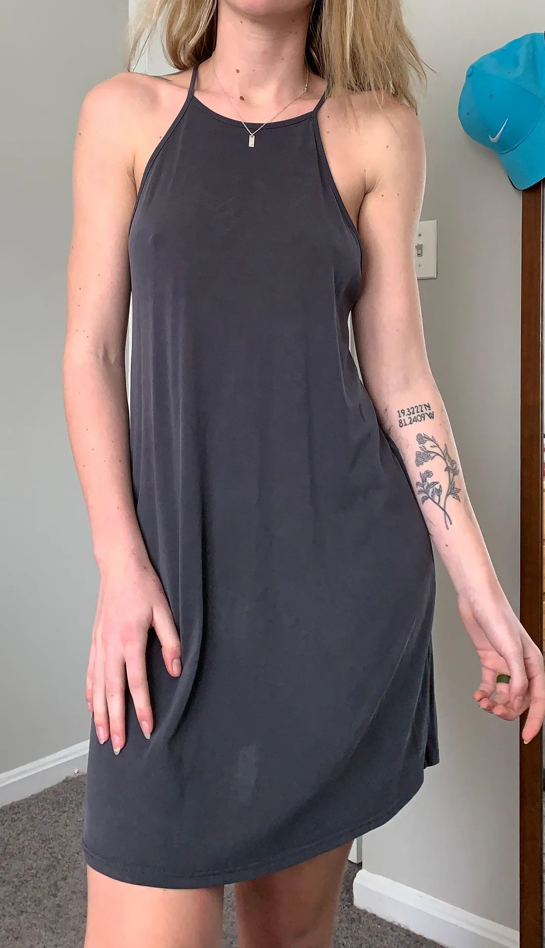 A super soft and flowy swing dress in a cool grey. Comes down to just above the knee. High neck desi... Show more