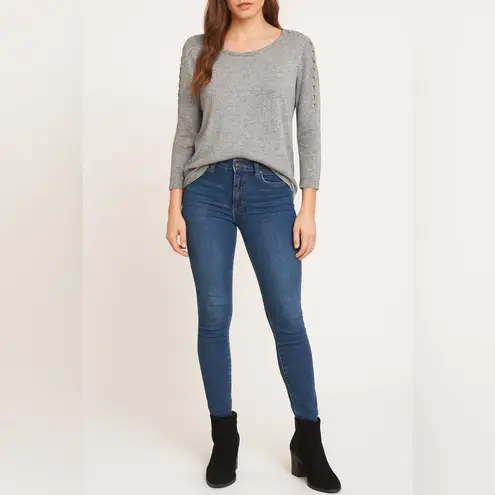 Soft heather gray knit long sleeve top featuring lattice cut-out sleeve details with tied cuffs. Relaxed fit with round neckline. Lightweight stretch blend (50% polyester, 50% rayon). Style vibe: Minimalist casual with chic sleeve cut-out design Size & Fit: Women’s Large Condition: Good pre-owned condition Perfect for: Casual everyday wear, layering, work-from-home comfort, or weekend outings. Styling ideas: Pair with jeans & sneakers for a casual weekend look, or with tailored trousers & boots for a chic office-ready outfit. minimalist, everyday style, casual chic, 90’s, *Note: model image was made using Al software and the item may not be 100% accurate. Please refer to photos for accurate product details.