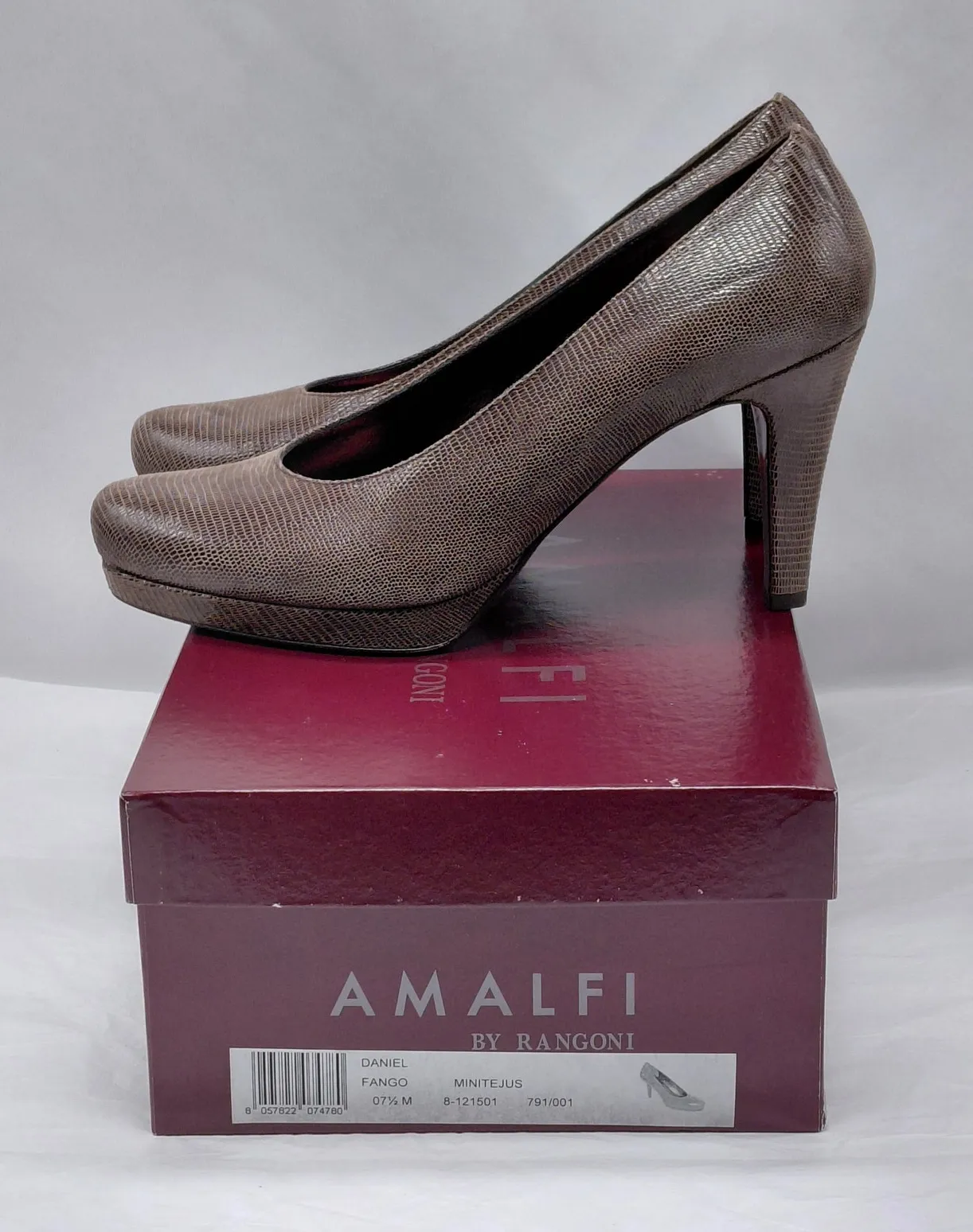 Amalfi by Rangoni Daniel Pumps Women's Size 7.5M Brown Textured Vegan Leather Made In Italy High Heel Platform Shoes Brand: Amalfi by Rangoni Style Name: Daniel Color: Fango Brown (textured / lizard-embossed look) Material: Vegan Leather Size: 7.5 M (Medium width) Made in: Italy Condition: New without box Features: Classic round toe platform pumps Elegant high heel with comfortable medium width Textured faux leather upper with subtle sheen for a luxe finish Cushioned insole for comfort Timeless Italian craftsmanship Heel Height: 3.5" Platform Height: 0.5" Style Aesthetics: Timeless Elegance Classic Office Chic Evening / Special Occasion Italian Luxury Minimalist Sophistication Occasions: Career / Workwear Cocktail & Dinner Outfits Weddings & Formal Events Dressy Everyday Wear 100125