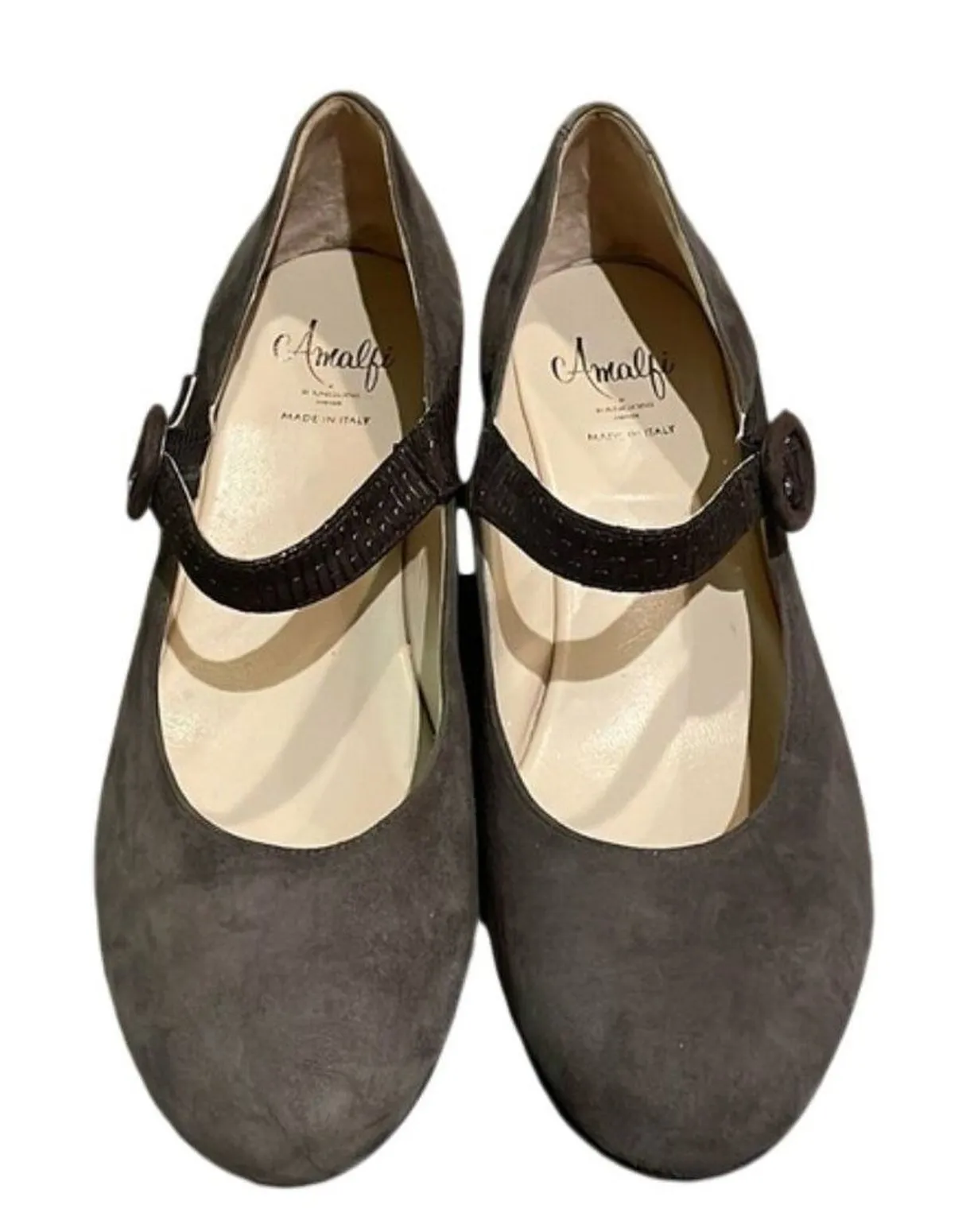 Taupe brown, suede leather, hidden wedge, Mary Jane shoe from Amalfi by Rangoni in a women's size 8.5N. Strap and wrapped heel is a contrasting textured, slightly darker leather. Leather lined insoles are very clean. Uppers in great shape with no signs of wear. Rubber soles. Made in Italy. Adjustable strap with buckle. In great pre-owned condition with minor signs of use. No box included. designer, classic, leather, Italian, pump, wedge, narrow