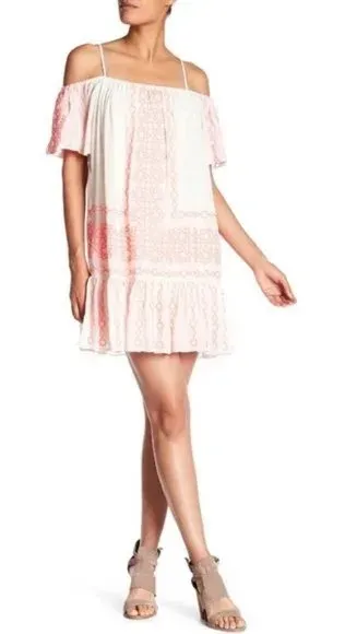 Chic off-shoulder dress with delicate pink patterns. Ideal for warm weather. Sz S EUC 🚭