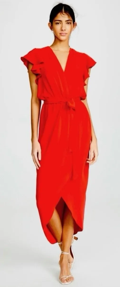 True red color Slinky weave fabric with a Tulip skirt, Flutter sleeves, Surplice neckline with sna... Show more