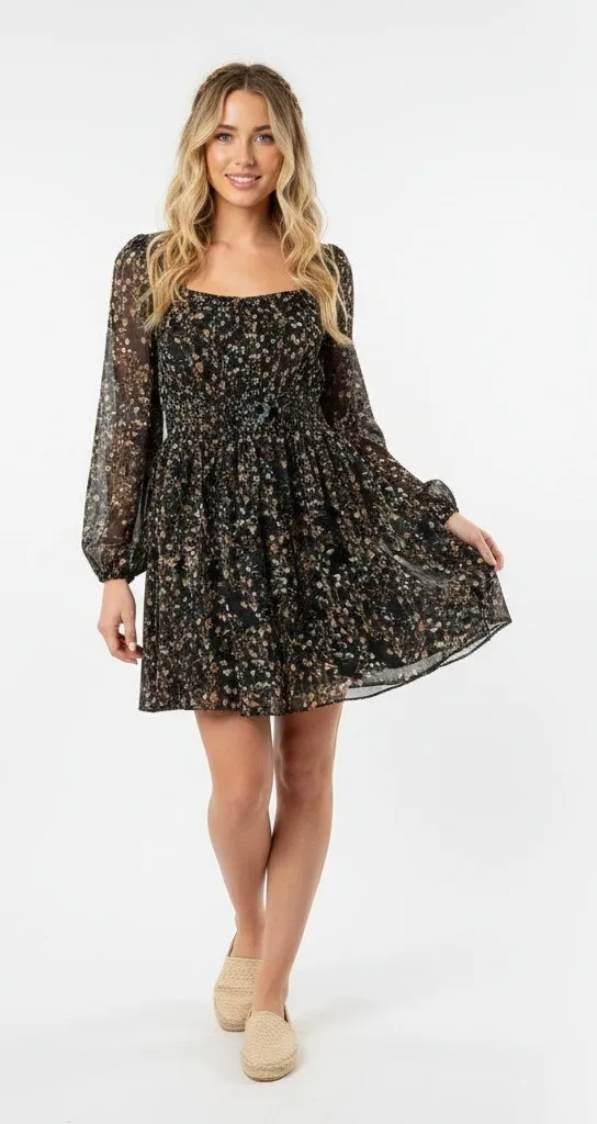 An Amaryllis mini dress crafted from deep black chiffon features peach and cream floral print, a flattering scoop neckline, smocked empire waist, playful A-line skirt, and sheer long sleeves, ideal for garden parties, casual brunches, or romantic evenings out. Mini Long Sleeve Chiffon Floral Scoop Neck Cottagecore Boho Bohemian Peasant Prairiecore Garden Party Brunch