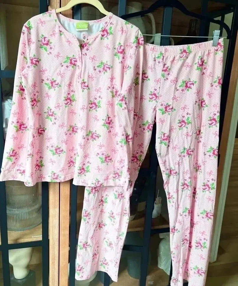 Girly pink bows & roses flower print Long sleeve shirt top Long pants with stretchy waistband Wome... Show more