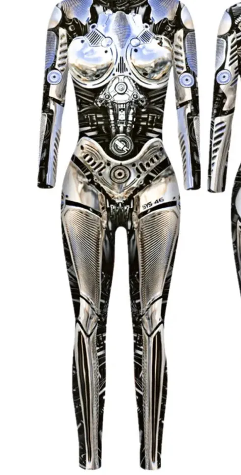 Futuristic cyberpunk skeleton robot cosplay jumpsuit bodysuit. Features intricate metallic design. P... Show more