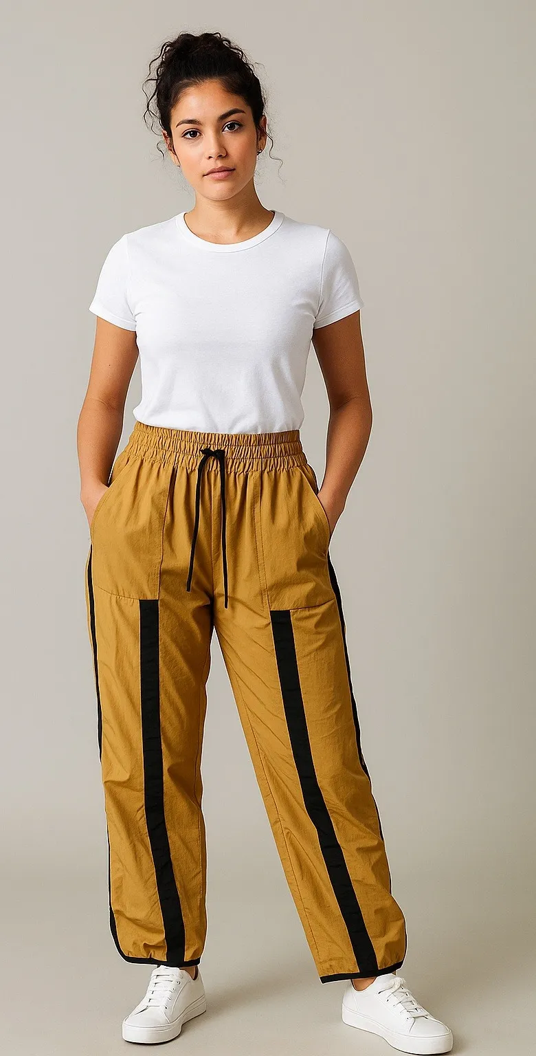 Fisoew Baggy Wide Leg Pants Camel wide-leg track pants with black contrast side stripes. Elastic wai... Show more