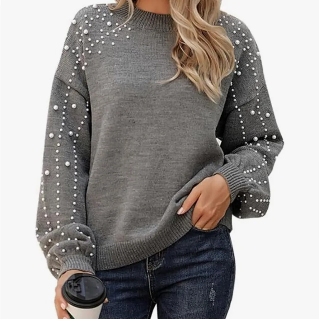 Stylish gray sweater featuring elegant pearl detailing on the sleeves. Perfect for a chic look.