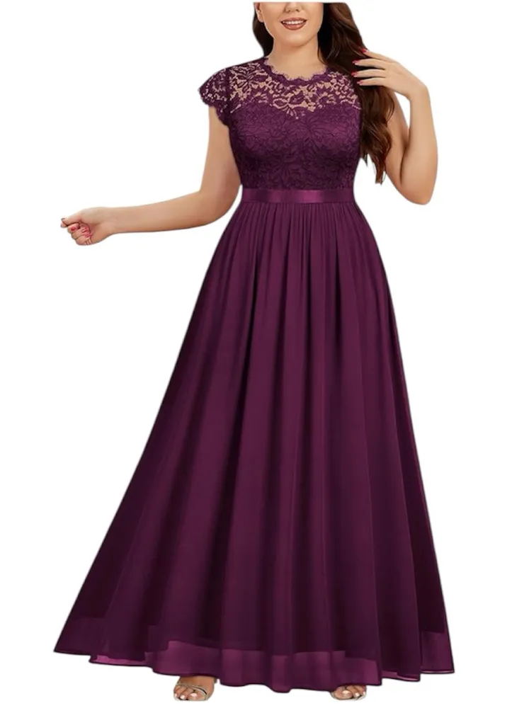 - Elegant pink purple maroon wine burgundy color evening gown with lace detailing. Perfect for formal occasions. Suitable for Bridesmaid Party, Formal Evening Prom and Night out Club. Scoop Neck, Vintage Half High Collar Design, Cap Sleeve. Lace Contrast Chiffon Style, Zipper On The Back, Long Dress. Dress tags - Church, summer, wedding, modest, event, graduation, travel, holiday, feminine, Christmas, grandma, bohemian, granola, resortwear, party, birthday, date night, boho, cottagecore, Vacation, flowy, casual, office, professional, Valentine's day, etc.