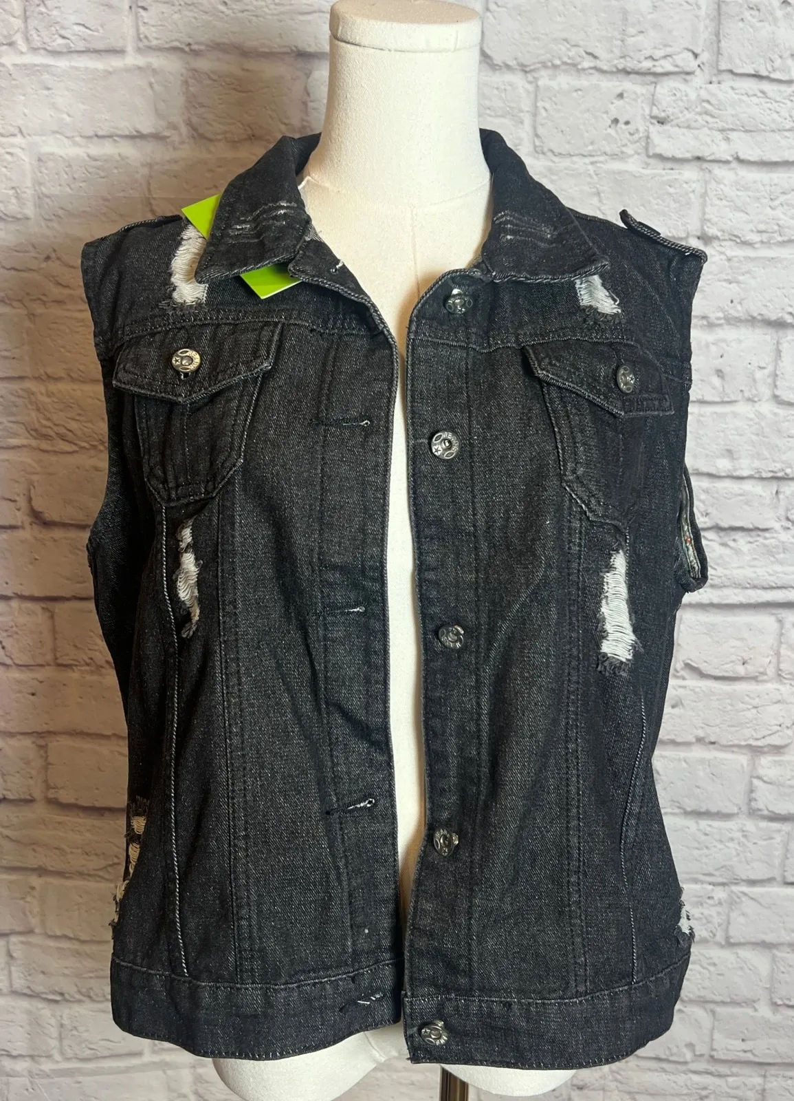 Two-piece outfit set including a black distressed denim vest and a gray ribbed long sleeve crop top.... Show more