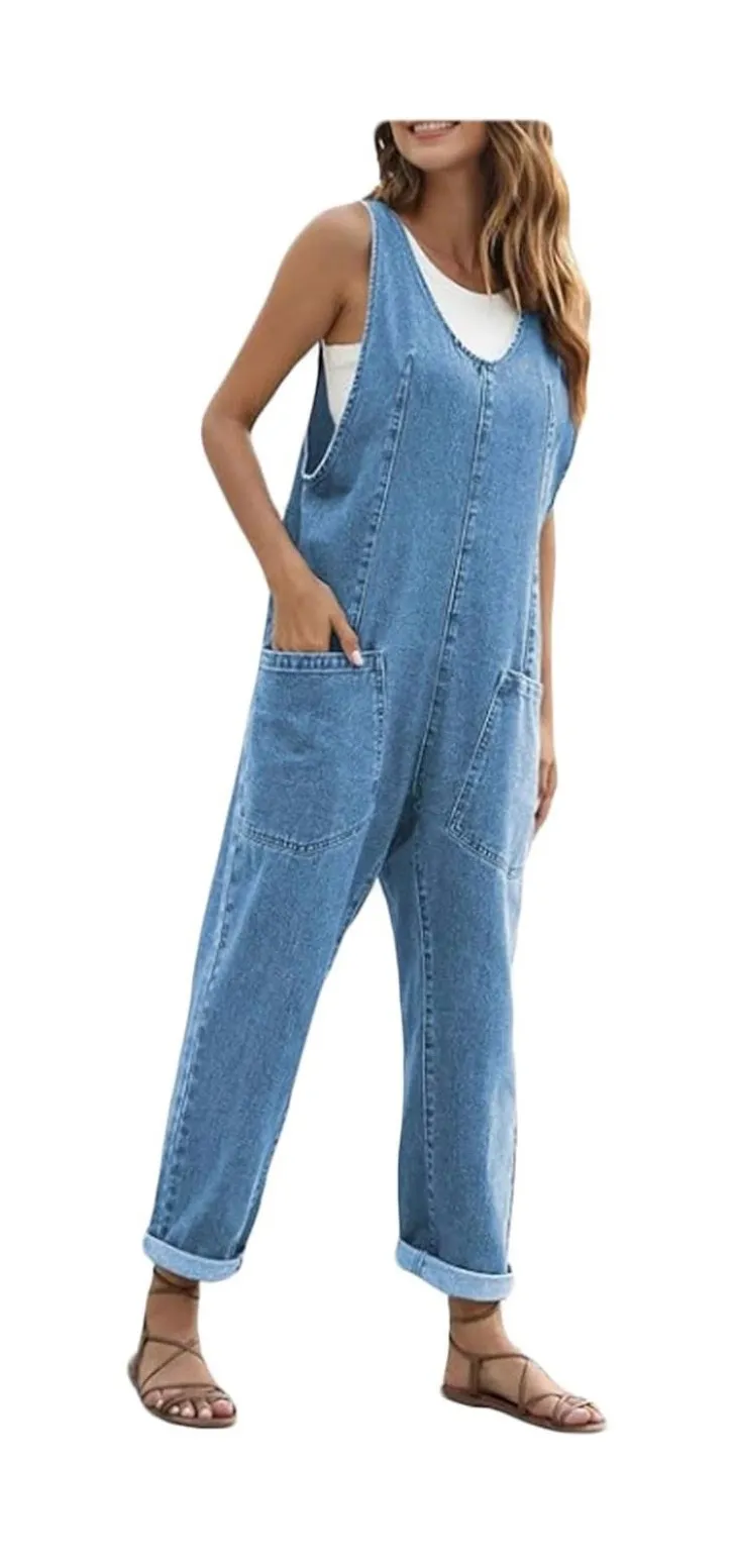 DARLING LOOSE FIT BLUE DENIM JEAN JUMPSUIT / OVERALLS SIZE SMALL 43% POLYESTER, 41% COTTON, 16% VISCOSE ADJUSTABLE STRAPS LARGE POCKETS IN FRONT COMFY & TOO TOO CUTE!!!!! NEW WITHOUT TAGS FROM AMAZON
