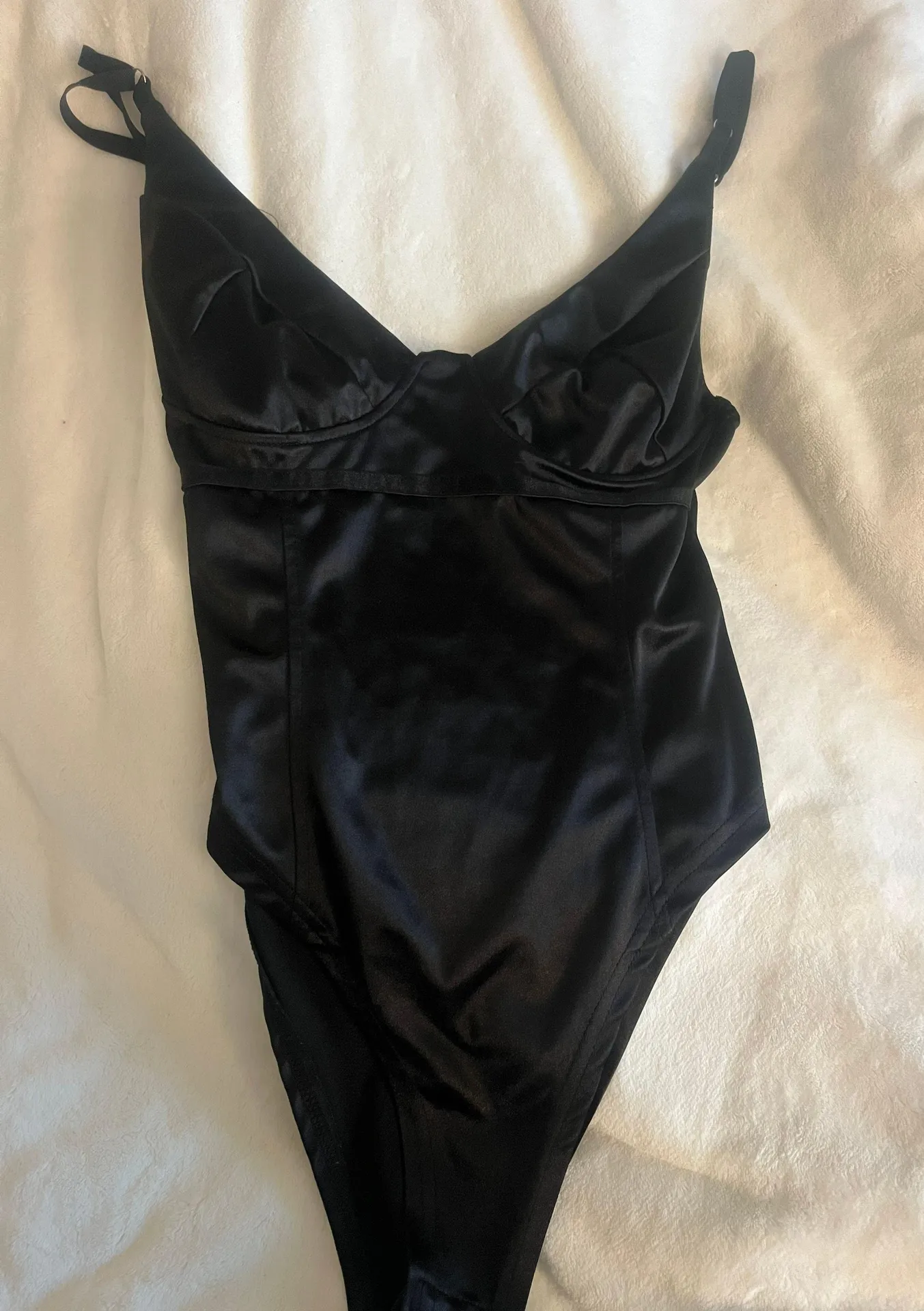 Only worn once black satin body suit with underwire bust and adjustable straps