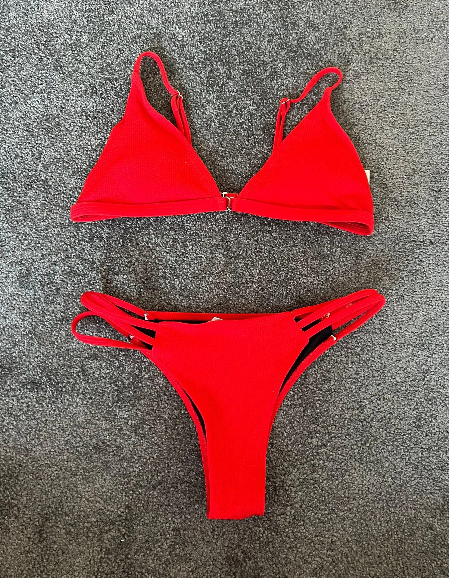 Red bikini. Straps on side with adjustable straps on the top for a good fit. Size large but fits lik... Show more