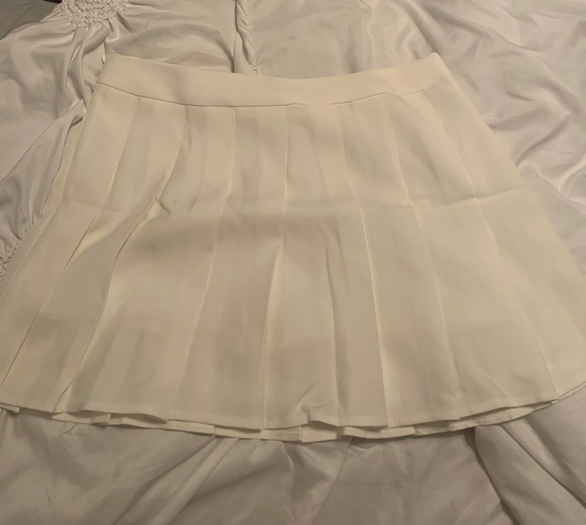 white pleated tennis/skater skirt. worn once for a sorority event!! had stretchy shorts underneath s... Show more