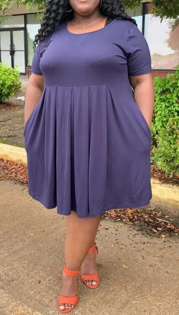 A women's purple short sleeve midi dress with a round neckline and a flattering pleated bodice. This dress features convenient side pockets and a comfortable, flowy silhouette. Crafted from a soft blend of rayon and spandex, it offers both comfort and a graceful drape. Style: T-Shirt Dress, A-Line, Trapeze & Swing Dress Length: Hi-Low Department: Women Sleeve Length: Short Sleeve Pattern: Solid Occasion: Casual Material: Rayon, Spandex Fabric Type: Rayon Neckline: Round Neck Season: Spring, Summer Sleeve Type: Cap Sleeve Closure: Pullover Accents: Pleated Features: Pockets Keywords: plus size, scoop neck, casual, everyday, comfortable, stretch, flowy, skater dress, a-line, pullover, breathable, lightweight, summer, spring