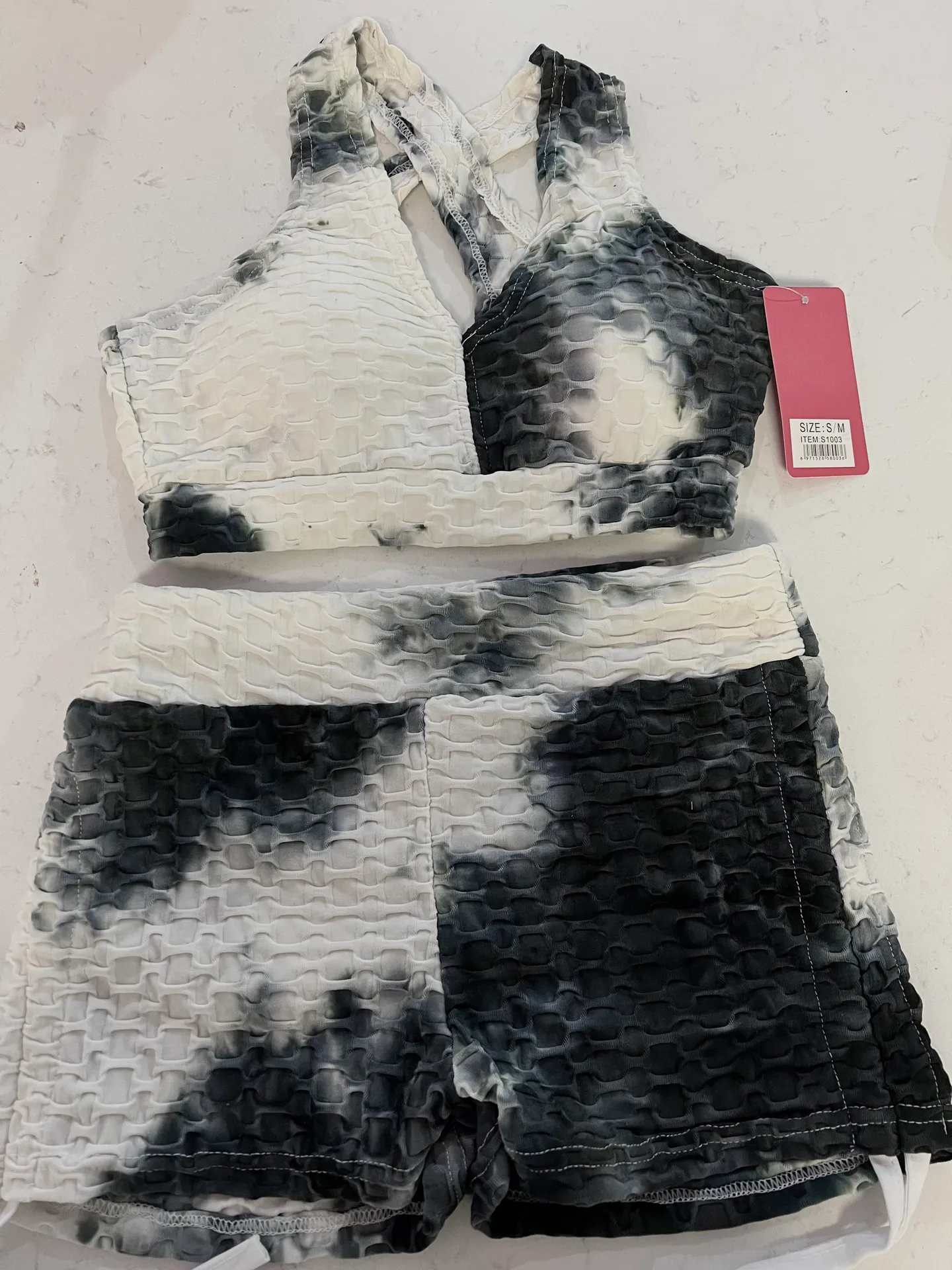 black and white scrunch butt detail cross back bottoms can be tied to fit padded support NWT