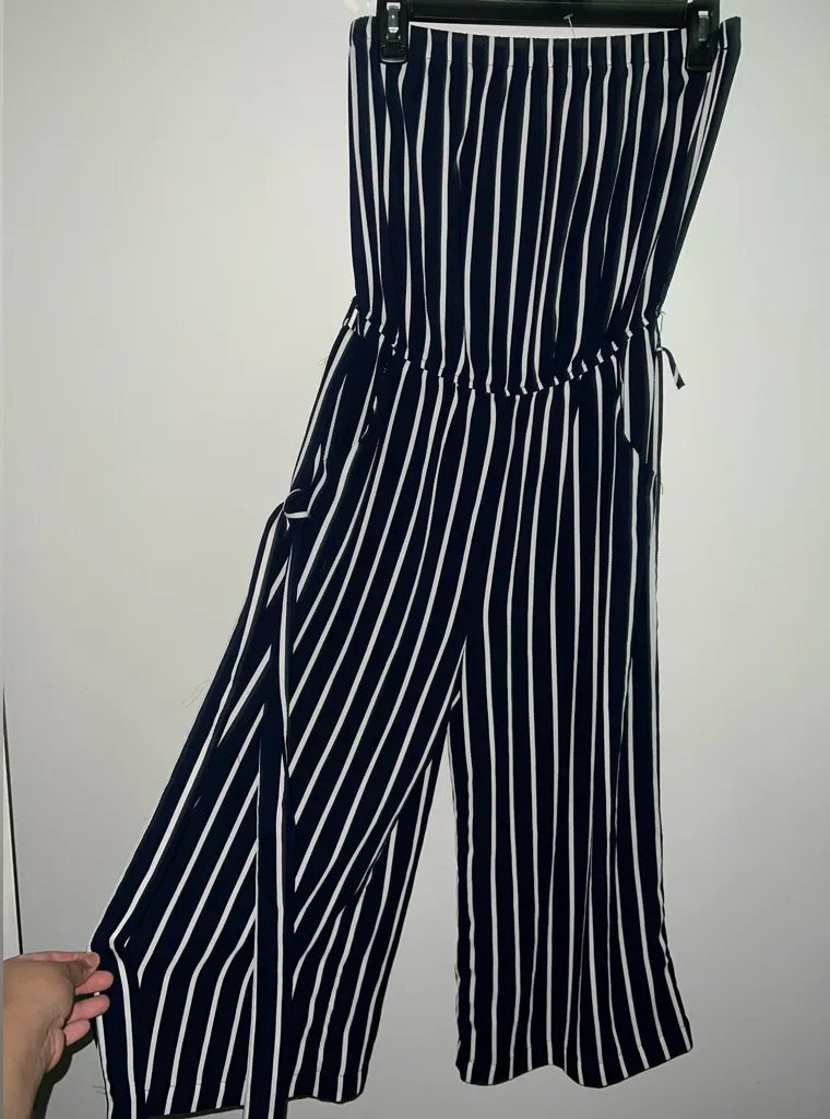 This Ambiance jumpsuit features a striking black and white pinstripe pattern, offering a timeless an... Show more