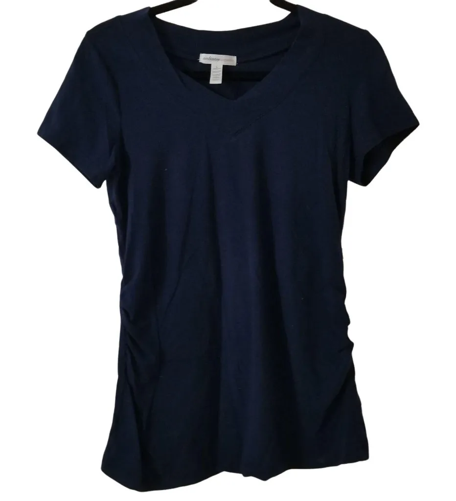 Crafted with a soft and stretchy cotton blend, this navy maternity t-shirt features a flattering V-neck design and short sleeves. Designed to grow with you, the fabric provides comfort and flexibility, making it a reliable choice during pregnancy. Its timeless navy color ensures versatile styling options for casual outings or relaxation. • V-neck design for a flattering fit • Short sleeves for breathable wear • Side ruching for a maternity-friendly fit • Stretchy material for enhanced mobility • Lightweight and easy to layer No visible damage or flaws detected. Features: V Neck Navy Color T Shirt All Season Solid Cambodia Size: Maternity L Flat Lay Approximate Bust 16 in Armpit to Bottom 17.5 in Shoulder to Bottom 25 in Condition: Pre-Owned Great Pre Loved Condition Smoke Free * Pet Friendly Home 60 - 813 maternity t-shirt, navy maternity top, v-neck maternity, cotton maternity tee, maternity navy shirt, pregnancy top, soft maternity tee, short sleeve maternity, stretchy maternity shirt, comfortable maternity wear, casual maternity shirt, breathable maternity shirt, Ambiance Maternity shirt