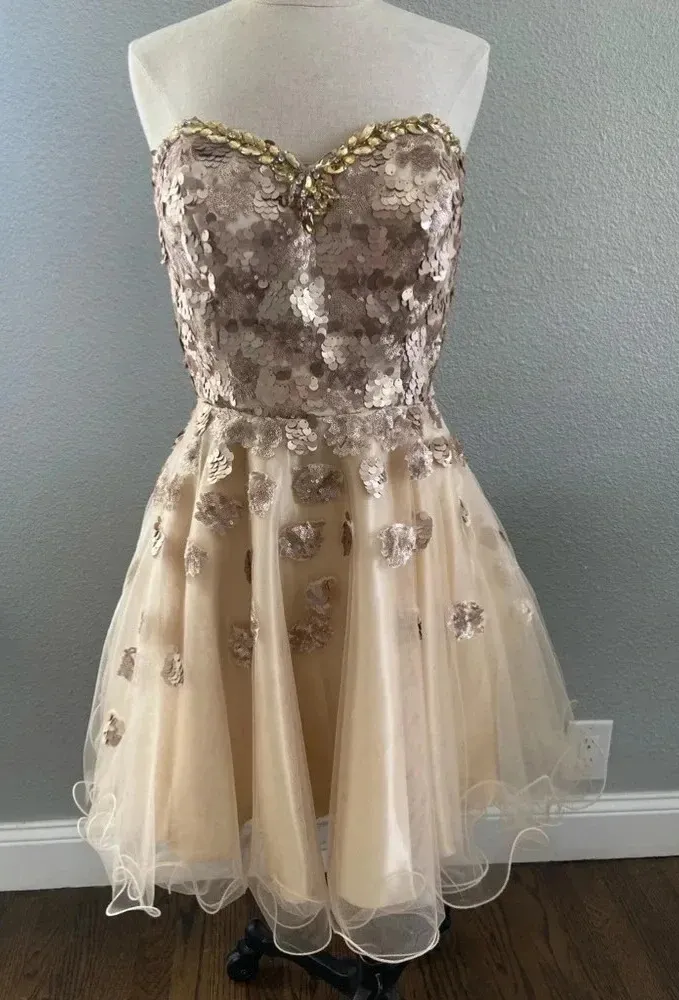 Amelia Couture gold taupe dress in excellent condition. Size 8 Features a ruffled hem Sweetheart neckline Sequin & rhinestones Skirt is gold color but the sequins are more of a taupe Bin#GK18