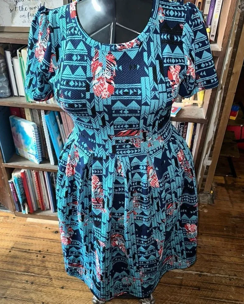 Lularoe blue southwest, red feather, stretchy, knit, fit and flare dress with pockets. Great for wor... Show more