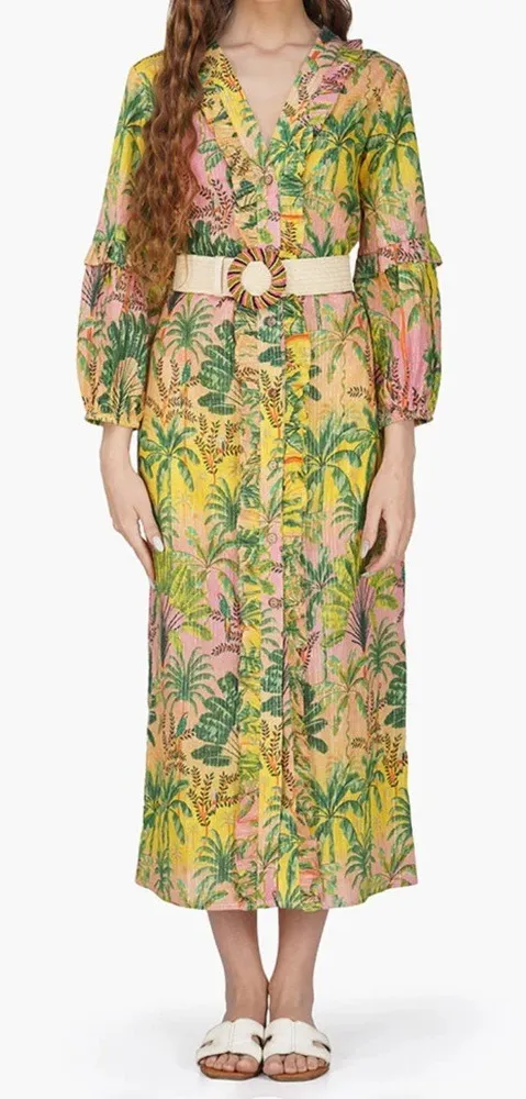 America & Beyond Endless Summer Tropical Floral Ruffle Shirt Dress Coverup Beaded Belt Medium. Embrace the endless fun of summer with the Printed Ruffles Shirt Dress! This cotton-lurex stripe maxi dress is the perfect breezy add-on for your next beach (or pool!) day. With a V-neck front and button-down placket, it's easy to slip on, while the three-quarter puff sleeves and frill details give it a fun 'lil personality. Don't forget to pop this cover up in your bag for some style on the go. Pair it with your favorite swimsuit or wear it on its own as a dress! Approx measurements: 16.5" pit to pit, 15" waist, & 50" length. New condition. No stains/flaws. Smoke/pet free home. Offers welcome. Bundle & save. Ship same/next day. Packaged w/ care.