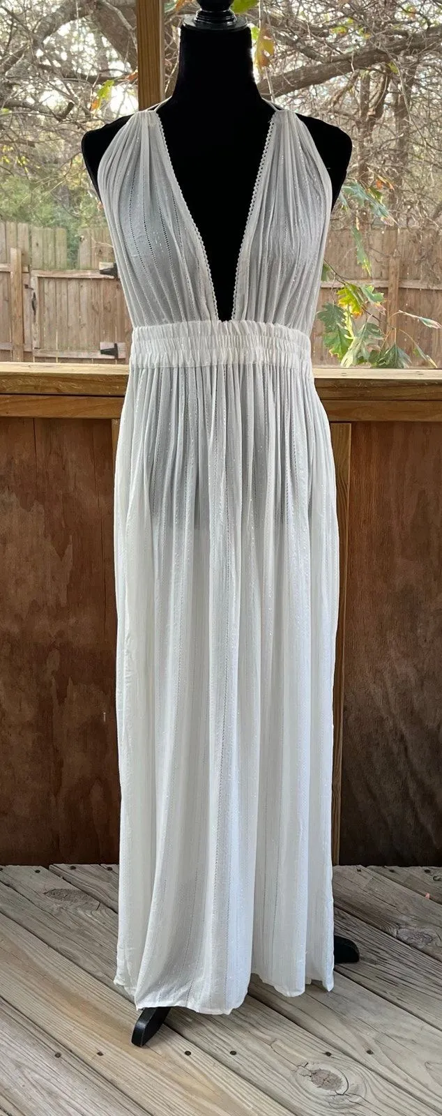 -Lightweight, gauzy fabric -Elastic waistband -Ties around back of neck -Side slits -Viscose/lurex -Hand washable Measures 16 inches across waistband and 42 inches from waist to hem. Measurements are taken laying flat and are approximate, not exact. Ships next business day Bundle discounts available Offers welcome! Thanks for shopping!
