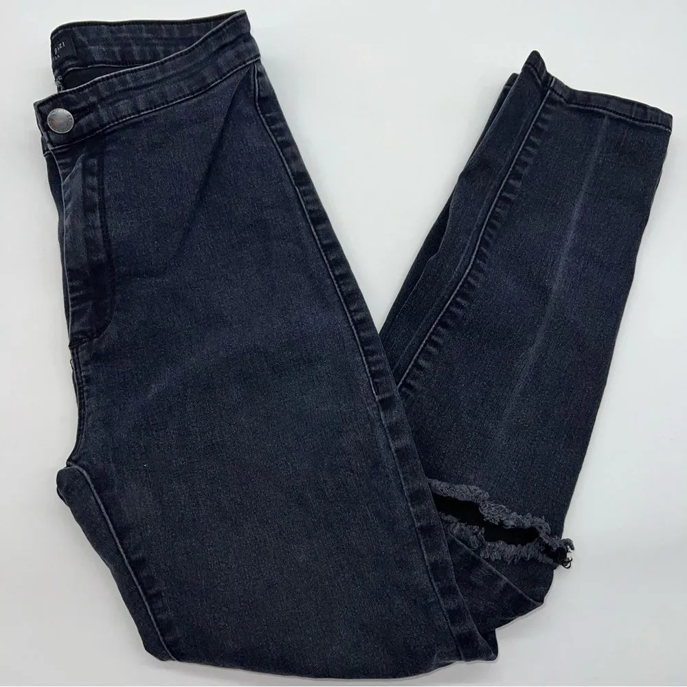 American Bazi Juniors Black Skinny Distressed Jeans w/Excellent Stretch. Zipper fly. Back pockets only. Some fading from washing. 80% Cotton, 18% Polyester, 2% Spandex Measurements: Waist- 26" Rise- 10.5" Inseam- 25.5" Inventory #0338