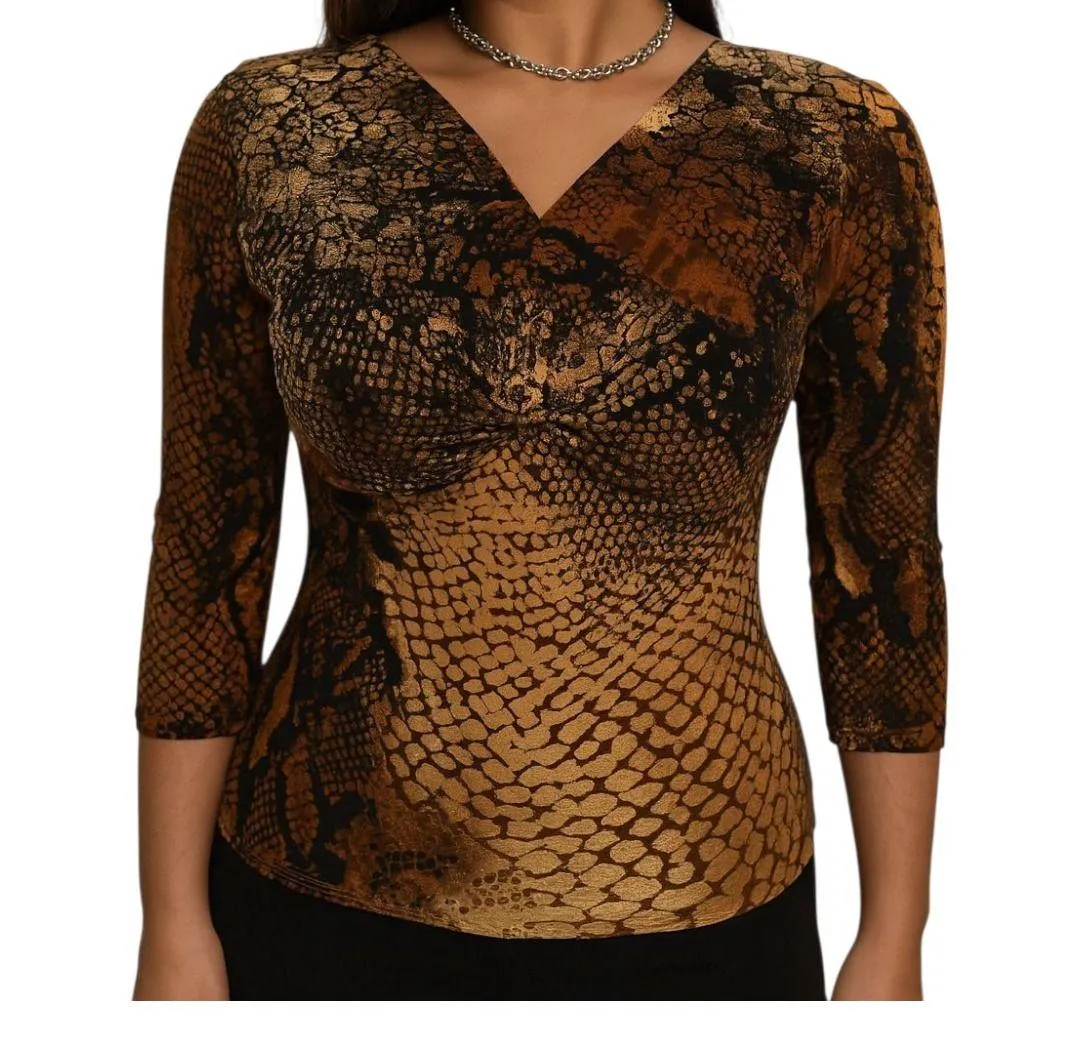 Unleash your inner wildcat with this stunning snakeskin print top, designed to hug your curves and make a bold statement. The striking snakeskin pattern, in rich shades of brown and black, is sure to turn heads and add a touch of edgy sophistication to any outfit. The flattering V-neckline and cinched detailing create a slimming silhouette, while the comfortable 3/4 sleeves offer the perfect balance of coverage and style. The unique print placement adds visual interest, making it a truly eye-catching piece. Wear this top for a night out with friends, a special date, or when you need an elevated business casual look. Color: Brown Type: Blouse Department: Women Style: Basic Material: Polyester, Spandex, Polyester Blend Neckline: V-Neck Sleeve Length: 3/4 Sleeve Sleeve Type: Classic/Fitted Sleeve Accents: Button Pattern: Animal Print Features: Fitted, V-Neck, 3/4 Sleeve, Cinched, Petite Fit: Slim 16" Bust 23" Length Keywords: snakeskin top, animal print top, petite blouse, brown top, black top, 3/4 sleeve top, v neck top, fitted top, american city wear, petite small, y2k, sexy top, party top, casual top
