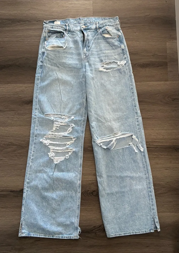 Stylish wide leg jeans. Light blue with distressed details. Perfect for casual wear. Size 10 Xlong... Show more