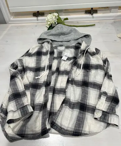 A plaid flannel button-up shirt with an attached hood. This comfortable shirt features a classic bla... Show more