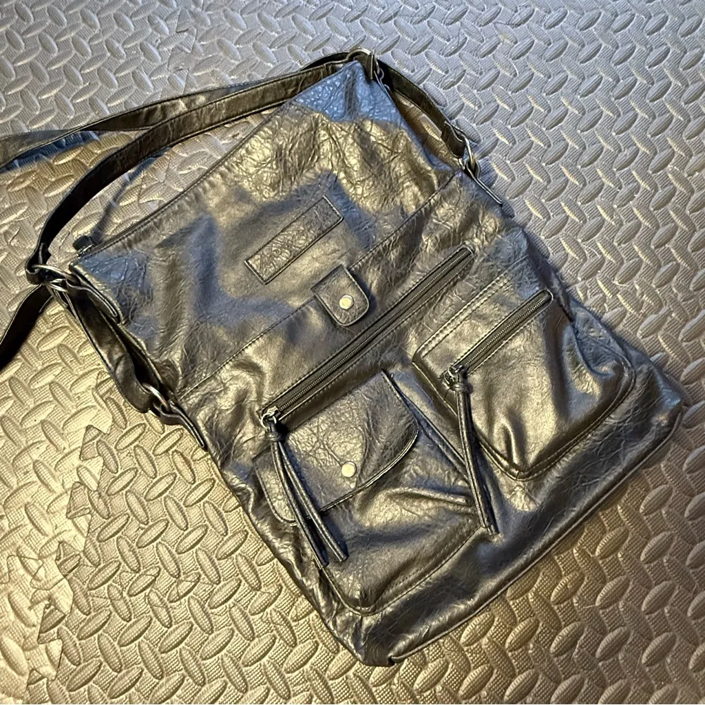 Black multi-strap bag with north south design. Zip & slit pockets inside & out. Fun multi-colored st... Show more