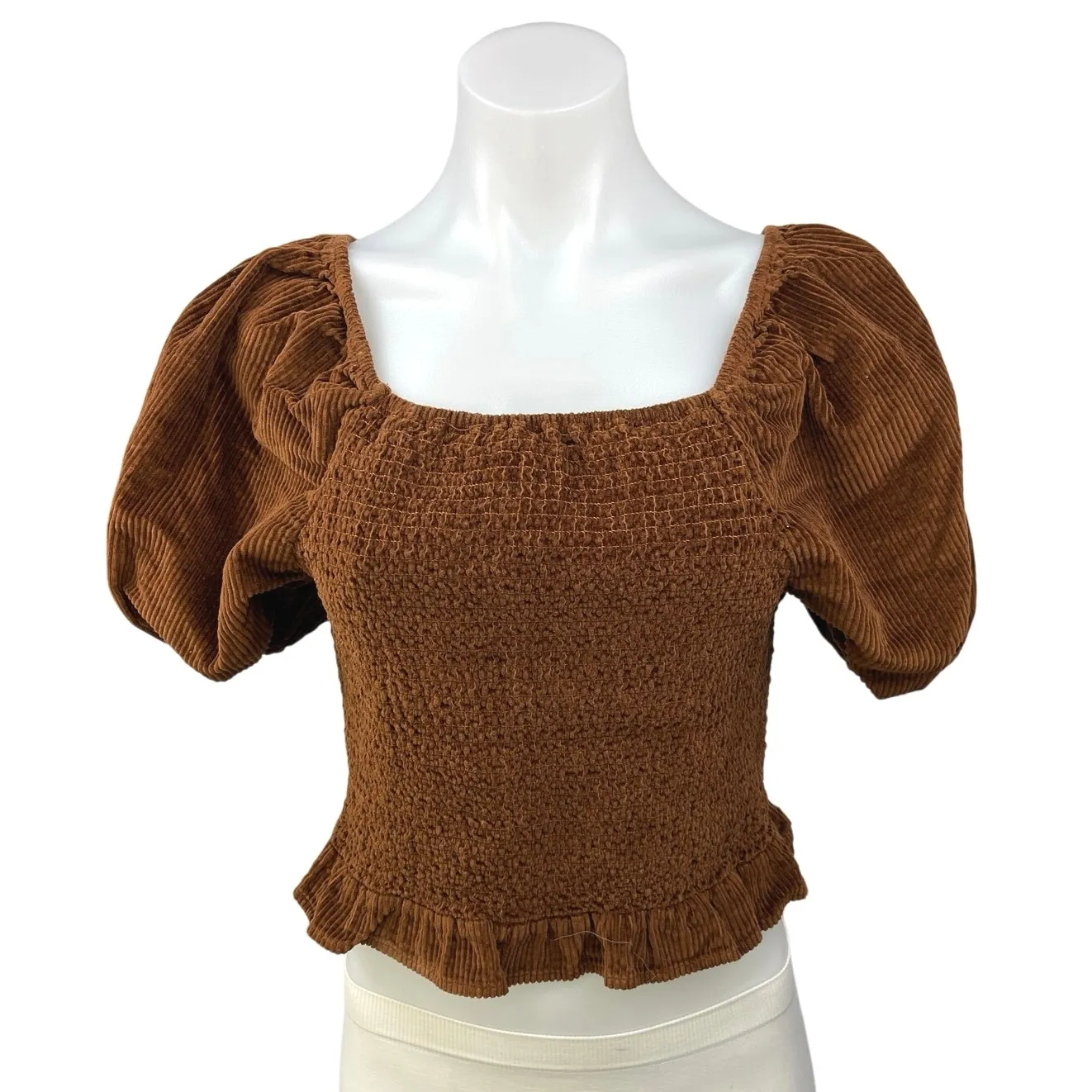American Eagle Brown Corduroy Peplum Smocked Velvet Velour Crop Top Blouse Size L Size: L Condition: Good Chest: 30” Length: 17” *Measurements are taken lying flat. We double the flat lay measurements of the chest. ** If displayed on a mannequin, the size is small; if on a plus-size mannequin, the size is extra large.