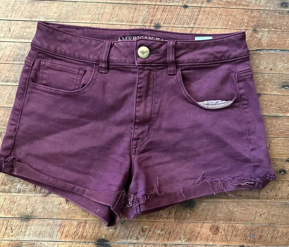 American Eagle burgundy, hi-rise, shortie shorts. Pairs well with a basic tee or button down shirt.... Show more