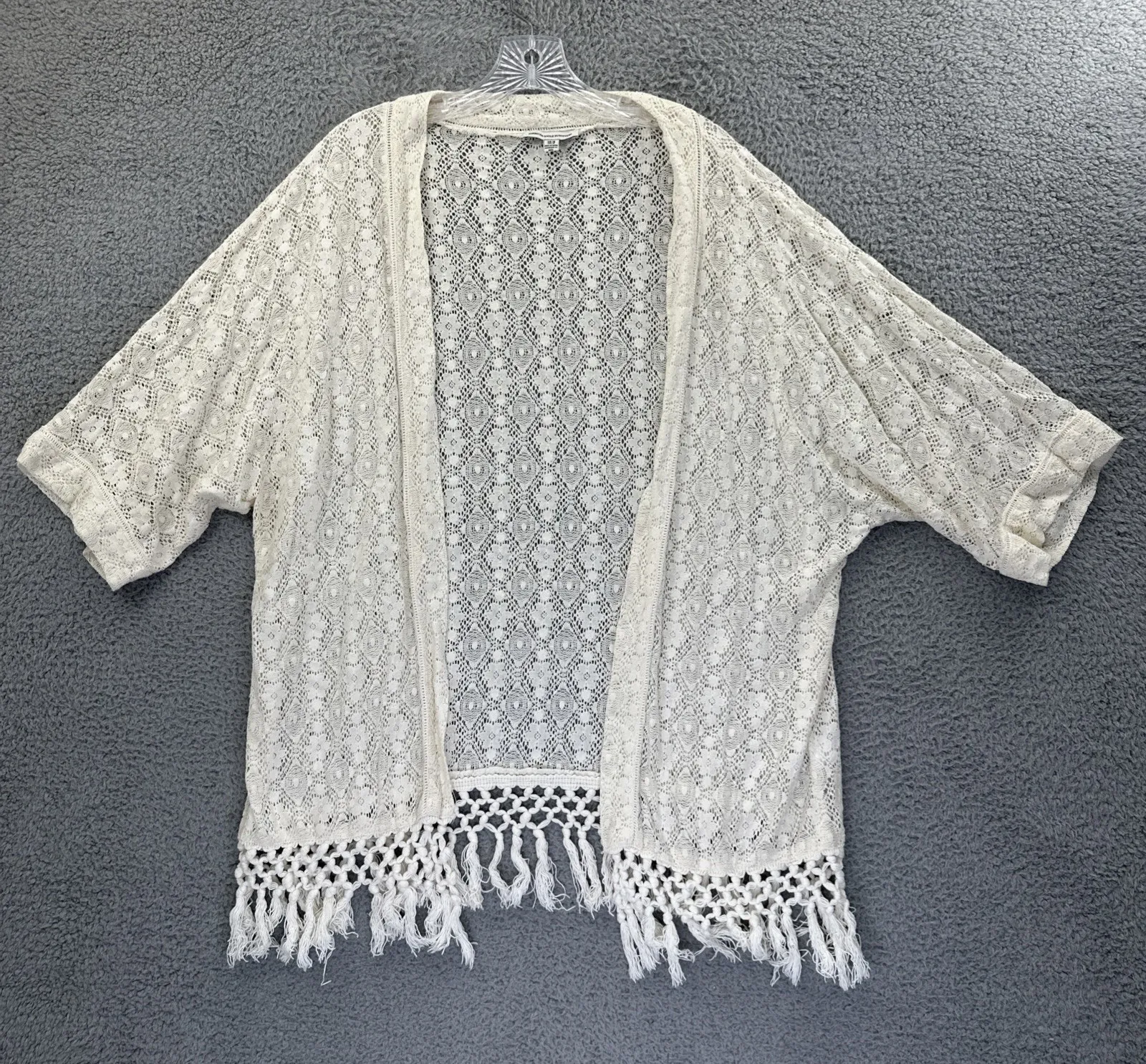 Open front 3/4 sleeves Crochet detail Fringe at the bottom Runs oversized Preowned. Gently used wi... Show more