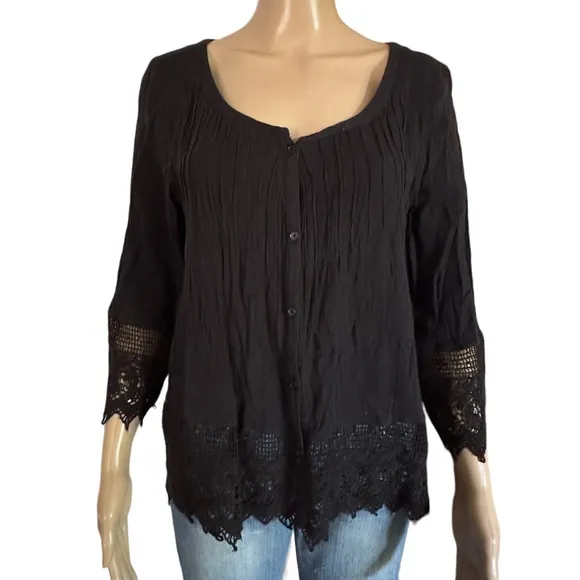 In excellent preowned condition. Buttoned front. 3/4 sleeves. Crochet lace trim on hem and sleeves.... Show more