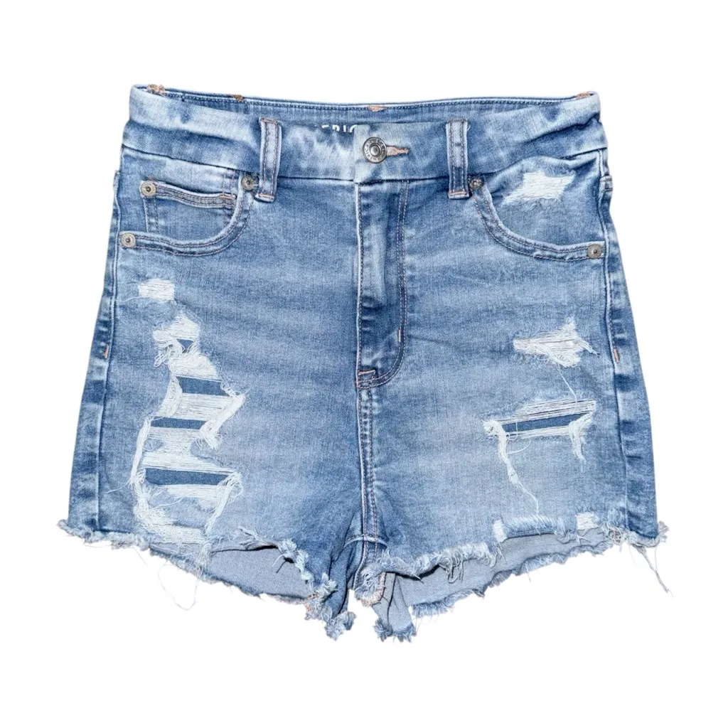 Cute and flattering pair of American Eagle Curvy Hi-Rise Shortie Jean Shorts in a light wash with di... Show more