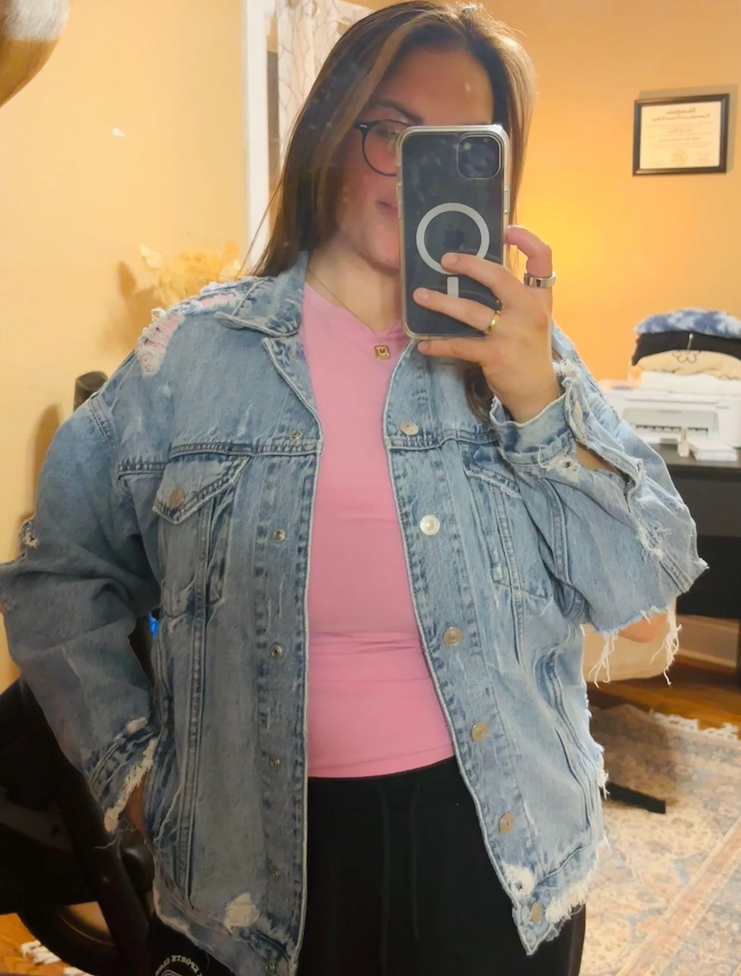 Distressed denim jacket Size M but oversized “boyfriend” fit - Top is also listed on my page! Aberc... Show more
