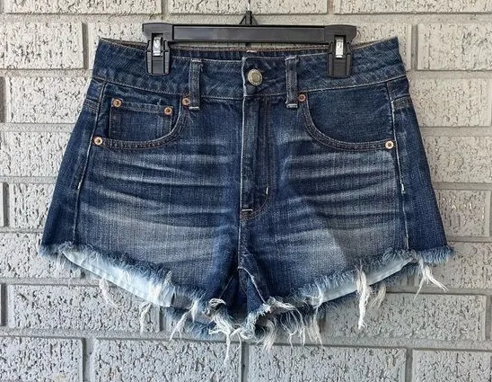 American Eagle Hi-Rise Festival Jean Shorts Dark Blue Wash Raw hem Whiskering Peek a boo pockets E... Show more