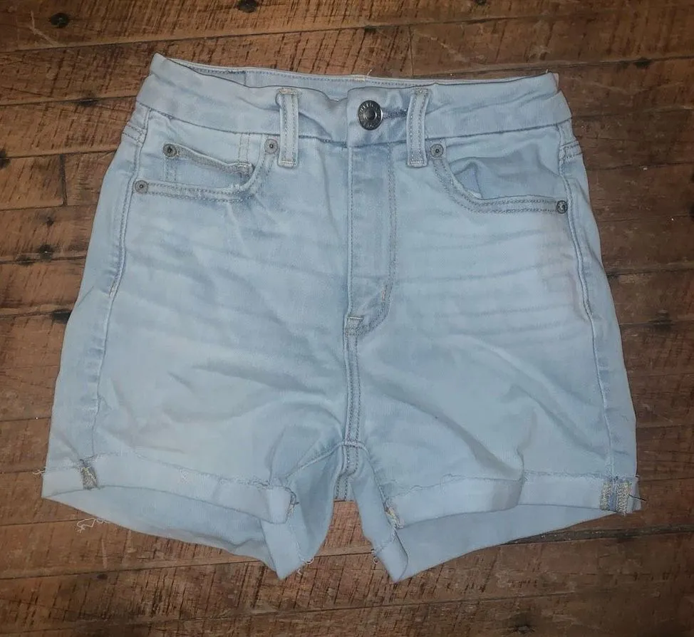 American Eagle light wash, distressed, curvy, hi-rise daisy duke shortie shorts. Pairs well with a c... Show more
