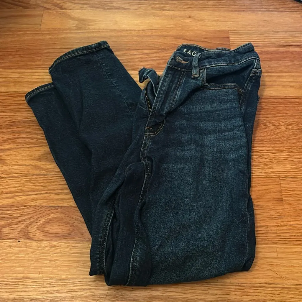Dark denim mom jean, stretch. Worn once. No flaws I could find.