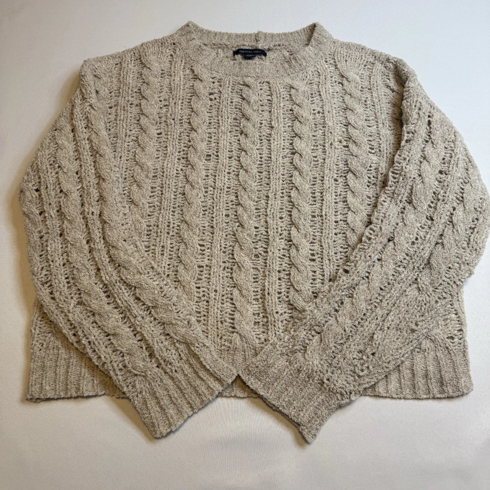 The American Eagle Open Cable Knit Tan Sweater is a cozy and trendy casual piece perfect for any sea... Show more