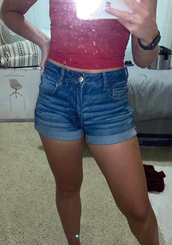 Medium wash Super stretch Hi-Rise Shortie Fits true to size.